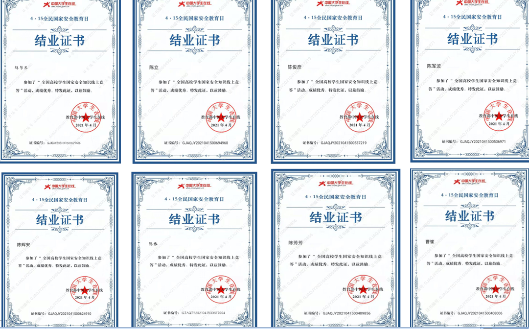 全市电大办学体系共971名学生参加了国开学习网首页《国家安全教育》学习及测试和“千万师生同上一堂国家安全教育课”主题公开课、“全国高校学生国家安全知识线上竞答”活动,并取得了相应的安全教育证书。