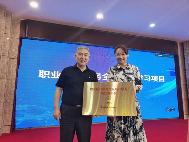 会议期间中国成人教育协会副会长、秘书长赵跃进为我校颁发了全国职业院校服务全民终身学习实验校牌匾。