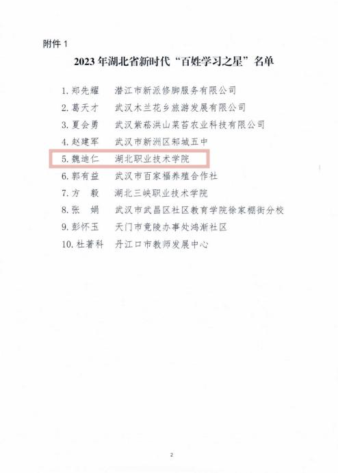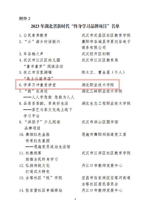 经各地教育行政部门推荐、省级专家评审,我校《学泽万冲童叟讲堂》入选2023年湖北省“终身学习品牌项目”,离休教师魏迪仁当选2023年湖北省“百姓学习之星”。