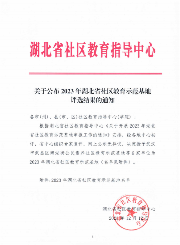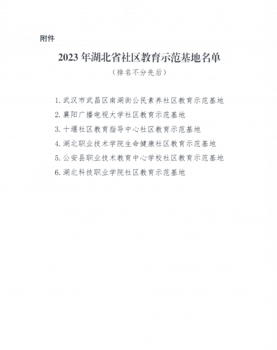 自9月份湖北省社区教育示范基地申报工作启动以来,学校社区教育学院认真提炼、积极迎检,经过第一阶段“材料初审、市级推荐”、第二阶段“远程汇报+现场答辩”, 学校生命健康社区教育示范基地等6家单位被授予2023年湖北省社区教育示范基地。